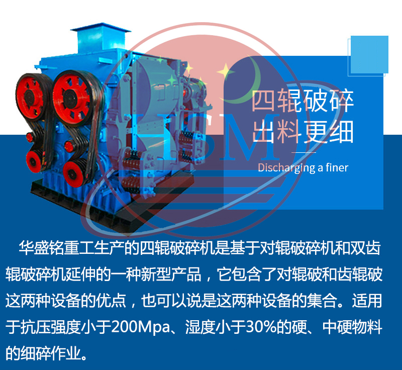 四輥破碎機也叫四齒輥破碎機,是一種冶金礦山設備配套中、細碎產品,適用進料粒度<90mm、成品粒度要求100目至5毫米的超細碎作業。四個輥面分為堆焊輥面或者平輥面,按照用戶要求粒度選擇組合,該設備具有結構緊湊,占地小,破碎比大、產量較高。